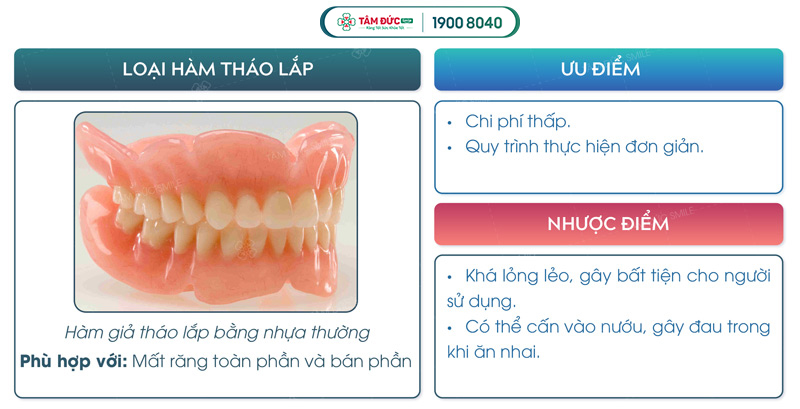 - Vệ sinh dễ dàng: hàm giả tháo lắp dễ tháo rời, dễ vệ sinh, giúp hạn chế những bệnh về răng miệng.