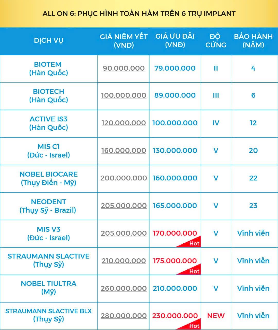 Trồng răng Implant giá bao nhiêu tuỳ thuộc vào phương án mà bác sĩ trao đổi với Quý khách sau khi thăm khám. Quý khách có thể tham khảo giá của từng trụ Implant đơn lẻ qua bảng bên dưới. Nếu cần tư vấn thêm để hiểu rõ về các dòng trụ này, Quý khách hãy liên hệ với chúng tôi qua Hotline: 0329851079 (Có sử dụng Zalo/Viber) hoặc nhập thông tin vào khung tư vấn bên dưới.