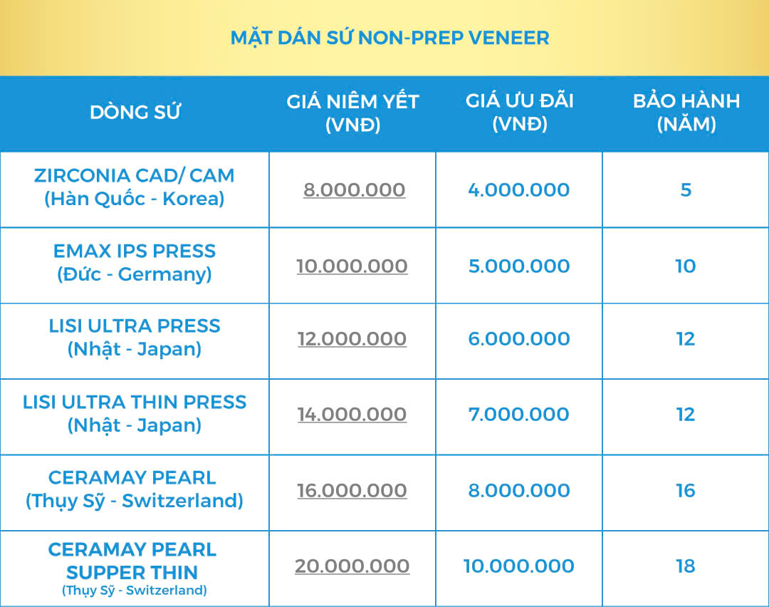 2. Bảng giá mặt dán sứ NON-PREP VENEER
