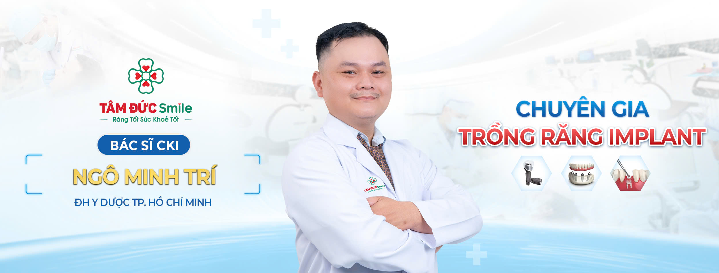 Với hơn 7 năm kinh nghiệm, Bác sĩ CKI - Ngô Minh Trí đang đảm nhận vai trò quan trọng tại Hệ thống Nha khoa Tâm Đức Smile - là một trong những Chuyên gia Trồng răng Implant ưu tú. Bên cạnh việc sở hữu nền tảng kiến thức chuyên môn cao, bác sĩ CKI -Ngô Minh Trí còn rất khéo léo trong kỹ thuật y khoa, tác phong làm việc chuyên nghiệp và thái độ ân cần, hết lòng giúp đỡ bệnh nhân. Đã có hàng nghìn ca bệnh mất răng (từ đơn giản đến phức tạp) được khôi phục hoàn toàn khả năng ăn nhai, sống vui vẻ và khỏe mạnh hơn sau khi tiếp nhận phác đồ điều trị từ bác sĩ CKI - Ngô Minh Trí.